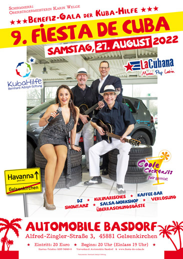 Am Samstag, 27. August 2022 veranstalten die Bernhard Adolph-Stiftung / Kuba Hilfe und Automobile Basdorf bereits zum neunten Mal die Benefizgala "Fiesta de Cuba" und sorgen einmal mehr für einen Hauch von Karibik mitten in Gelsenkirchen.